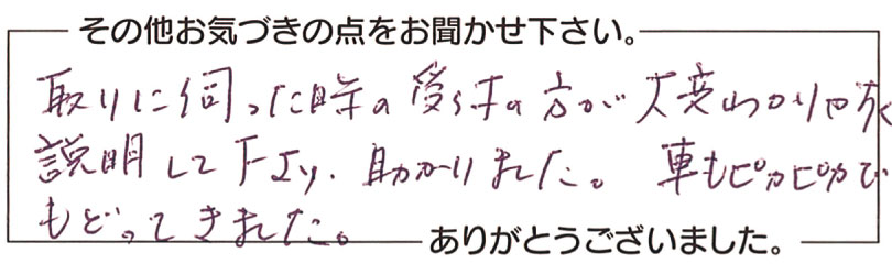 I.O.さま 取りに伺った時の受付の方が大変わかりやすく説明して下さり、助かりました。車もピカピカでもどってきました。