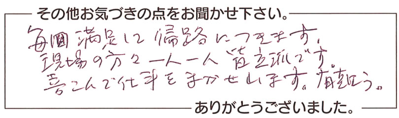 M.S.さま 毎回満足して帰路につきます。現場の方々一人一人皆立派です。喜んで仕事をまかせれます。有難う。