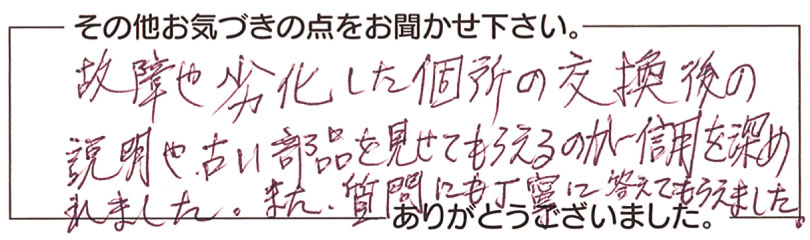 H.K.さま 故障や劣化した個所の交換後の説明や、古い部品を見せてもらえるのが信用を深めれました。また質問にも丁寧に答えてもらえました。