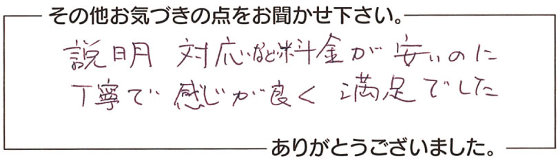 O.T.さま 説明 対応など料金が安いのに丁寧で感じが良く満足でした。